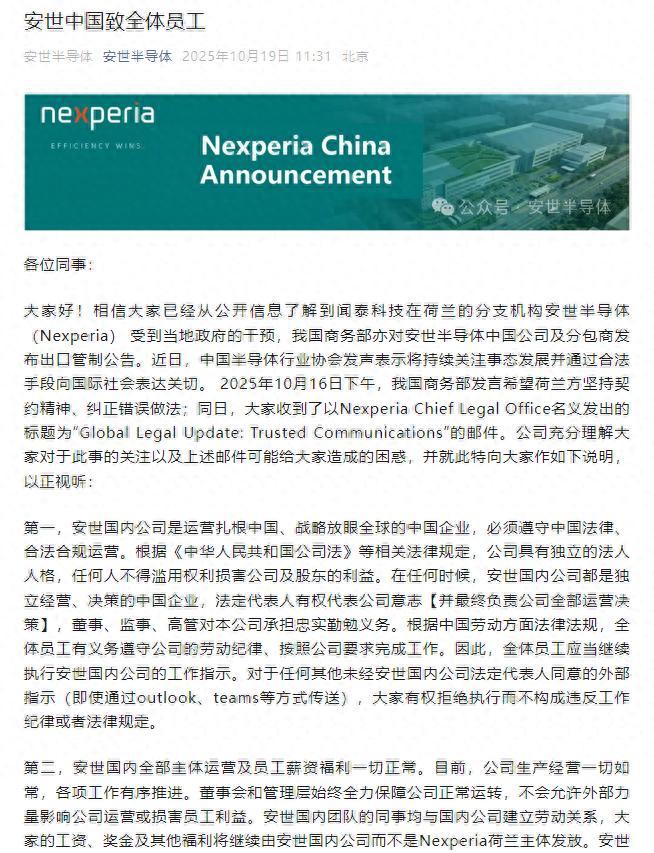 然而,荷蘭政府未曾料到的是,安世中國區選擇了硬性對抗。10月19日,安世中國公司發佈公開信,對於“任何其他未經安世國內公司法定代表人同意的外部指示(即使通過公司正規流程下達指令),員工也有權拒絕執行而不構成違反工作紀律”。