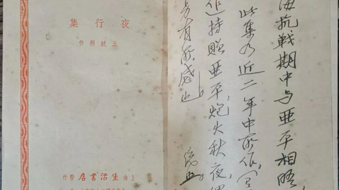 我所藏的這本《夜行集》(上圖),雖左上角有點破損,卻爲我所特別珍愛。這是因爲此書前環襯第二頁上有王統照的整頁鋼筆題簽,力透紙背: