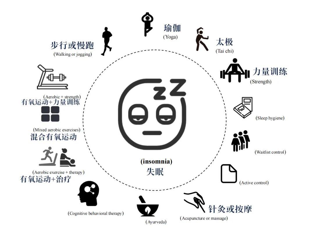 瑜伽、太極、步行和慢跑在提升睡眠效率、延長睡眠時間、縮短入睡時間等方面表現突出。其中,瑜伽對總睡眠時間的增加效果最爲顯著(平均延長110分鐘),太極可改善睡眠結構,步行與慢跑則能有效緩解失眠引發的日間功能障礙。