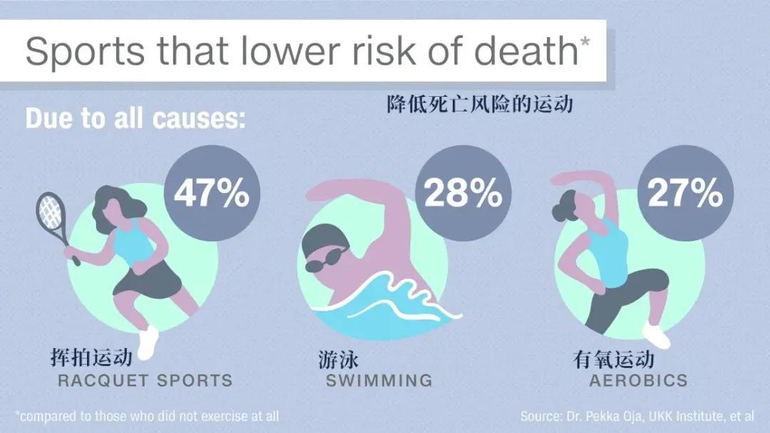 適量運動有助延壽。2016年《英國體育醫學雜誌》一項涉及8萬人,關於不同種類運動和全因死亡率的關係研究發現:最佳的延壽運動是——揮拍類運動(羽毛球、乒乓球、網球等),可以降低全因死亡率47%。