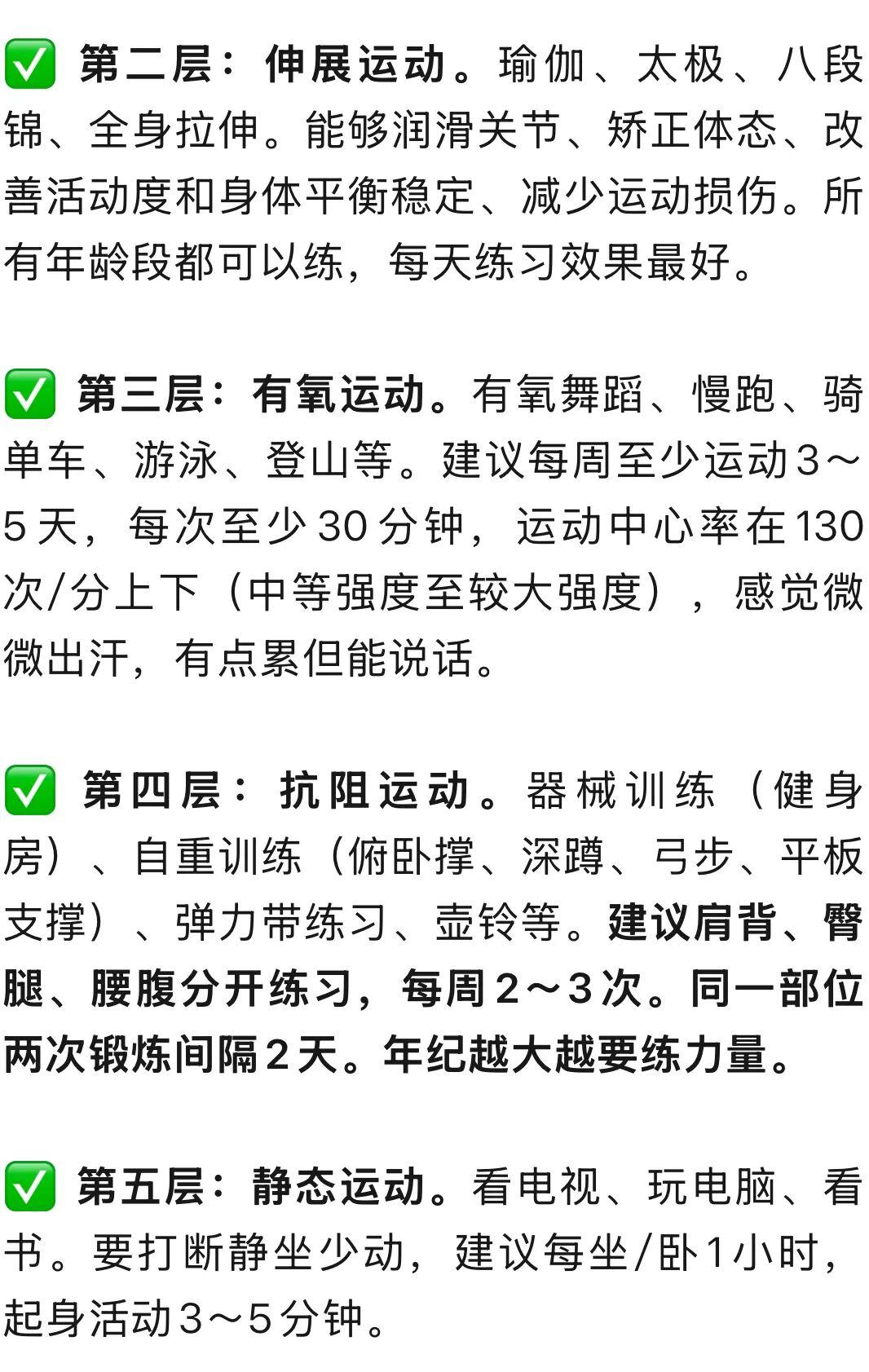 ✅ 第一層:日常活動。走路、爬樓梯、園藝活動、做家務、上下班、上街、辦事、購物騎單車等。日常活動有助對抗久坐、維持代謝、偷偷燃脂。建議每天數次,積少成多。利用一切機會動起來。