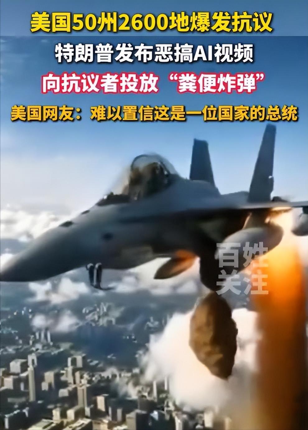 特朗普本人的回應引人注目,他居然在社交平臺上發佈了一段AI生成的視頻,顯示自己頭戴王冠,駕駛一架寫着“特朗普國王”字樣的戰機飛越美國城市,並向下方的示威者空投糞便。