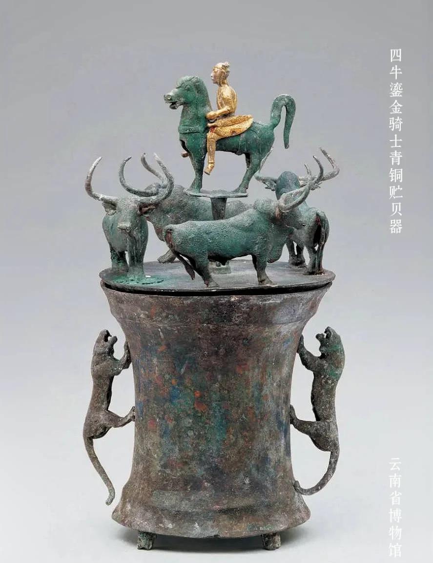 貯貝器在詩裏是古滇國的圖騰,雖然古滇國真正的圖騰未必是貯貝器,但作爲一件標誌性青銅器,豹子、野牛、金色騎馬人——它們從時間深處帶來的政治、經濟和文化信息,足以代表那個年代的圖騰,同時把西南直到今天依然存在的人與大自然的角鬥、時間無可阻擋這些亙古不變的哲學命題,再清楚不過地呈現在我們面前。面對這件神性畢現的物體,我們會情不自禁地發出拷問:“我”是誰?“我”從哪裏來?要到哪裏去?詩人通過長詩告訴我們,“我”是騎在馬上的那個小金人,“我”從與豺狼虎豹等兇猛動物的搏鬥中,從野牛的馴養和食物的獲取中而來,“我”騎着那匹奔跑的馬,沒有別的去處,只有向詩人稱爲“時間世界”的深處走去。