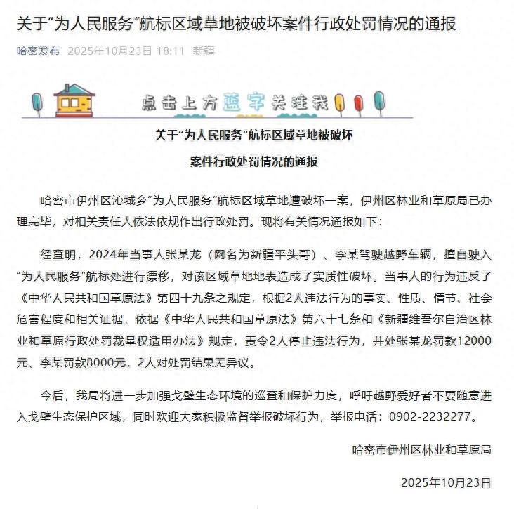 10月23日,新疆 哈密市伊州區林業和草原局 發佈關於 “爲人民服務”航標 區域草地 被破壞案件行政處罰 情況的通報,全文如下。