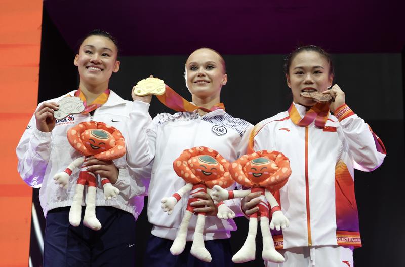 中立選手梅爾尼科娃、美國選手黃莉安(左)和張清穎分獲世錦賽女子個人全能冠亞季軍