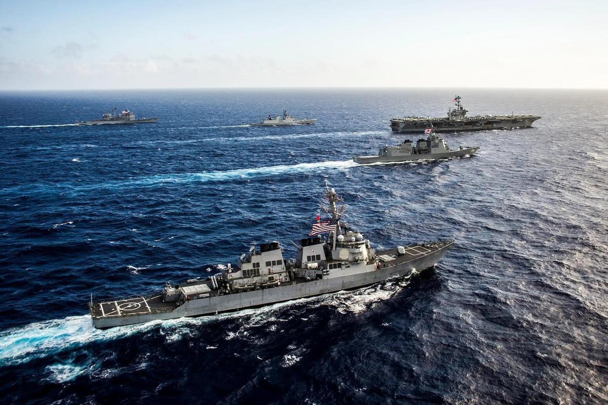 去年,這裏也發生過類似演習,但那時是“卡爾·文森”號航母擔任主角,這次卻截然不同,美軍艦破天荒地退居二線,承擔起護衛職責。