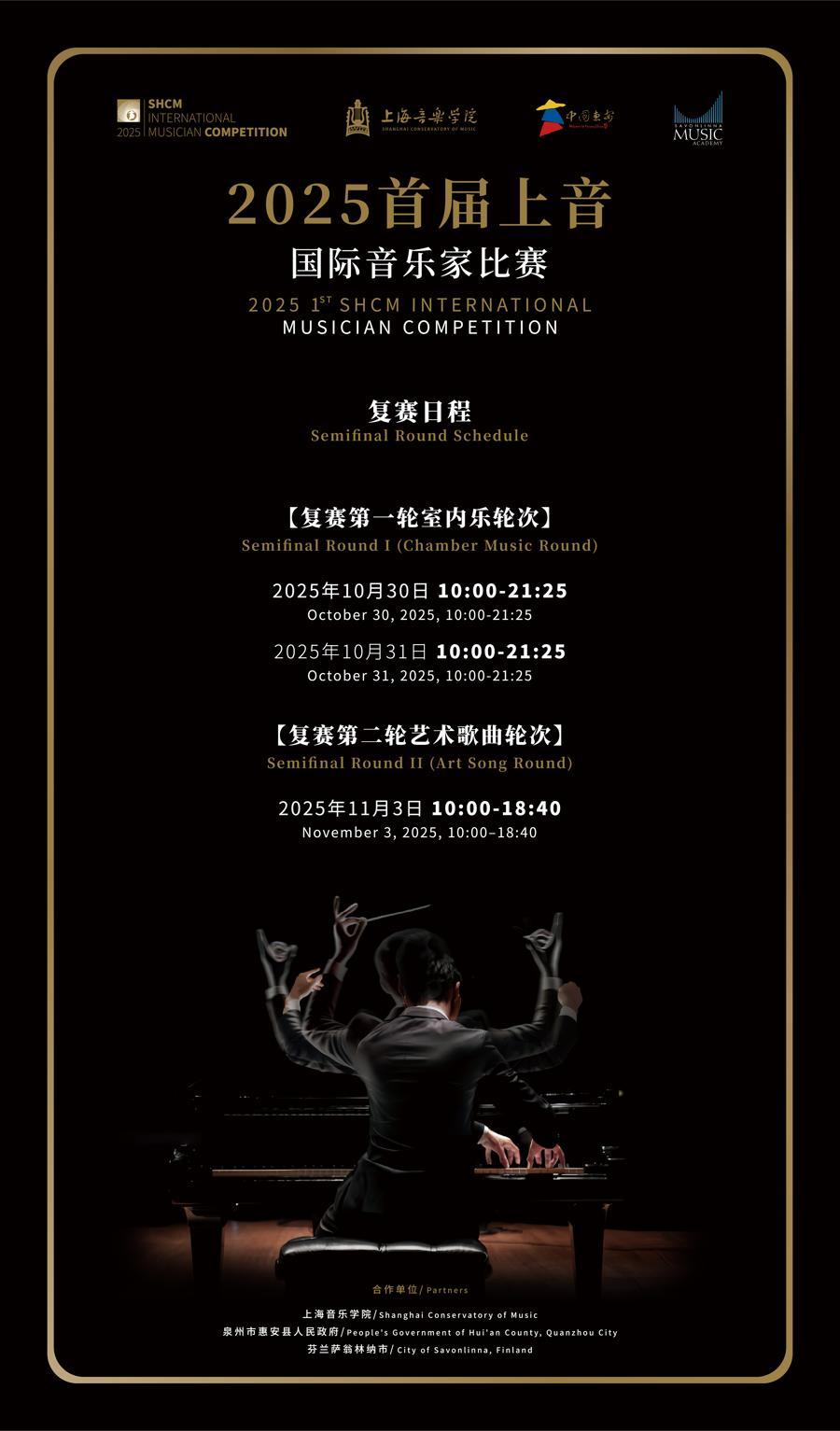 首屆“上音國際音樂家比賽”由上海音樂學院攜手福建泉州市惠安人民政府與芬蘭薩翁林納音樂學院等海外合作院校機構聯合舉辦。這一新創賽事是世界範圍內首個以“音樂家比賽”命名的國際賽事,其創新性地構建了三輪不同類別的競賽單元,全面、系統地評估選手的綜合藝術素養與實踐能力。