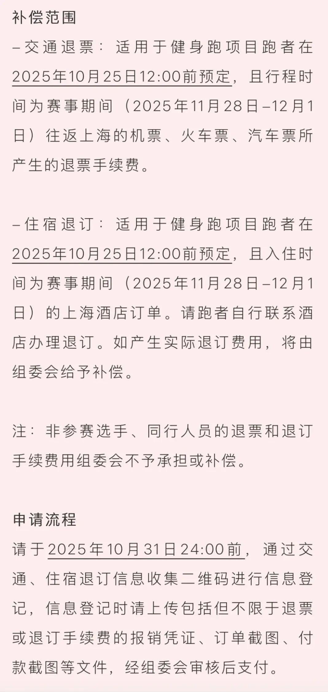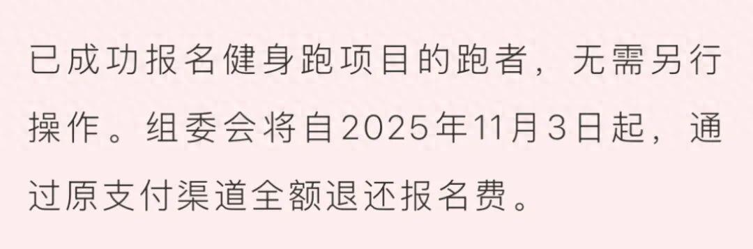爲呈現一場更專業、更貼心的奔跑盛宴,組委會經過慎重研究,決定取消2025上海馬拉松健身跑項目和2025上海馬拉松慈善名額報名。我們深知每一位跑者都爲這場比賽付出了熱切的期待與精心的準備,對於上述調整可能給您帶來的不便,我們深感歉意,也萬分感謝您的理解與包容。爲妥善做好後續事宜,現將具體安排公告如下: