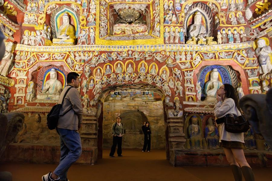濱港商業中心6樓,趣看美術館、雲岡研究院等打造的“雲海相望——雲岡石窟藝術特展”吸引人們夜遊觀展。該展覽看點頗多,還原的佛身上半段讓人們有機會與大佛“平視”,淡淡的小鬍子凸顯了印度犍陀羅風格,呈現出雲岡石窟濃郁的“胡風胡韻”。通過AI技術復原的“西立佛”,將碎石瓦礫“放歸原處”,讓人們見到西立佛坍塌前的模樣。值得一提的還有位於街區中海派文化中心旁的“雲岡十二窟”展區,這裏“搬”來了全球首例可移動3D打印複製洞窟,讓人們足不出“滬”就能欣賞到中國四大石窟之一的壯美。