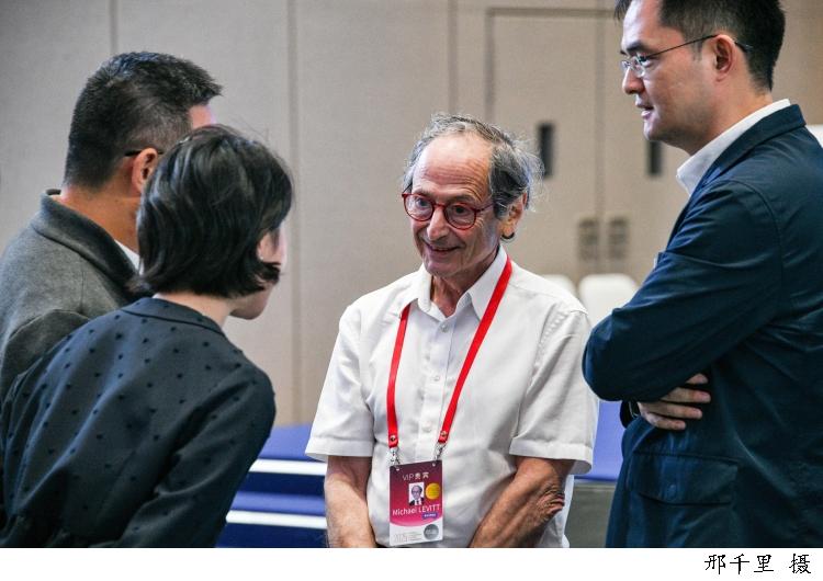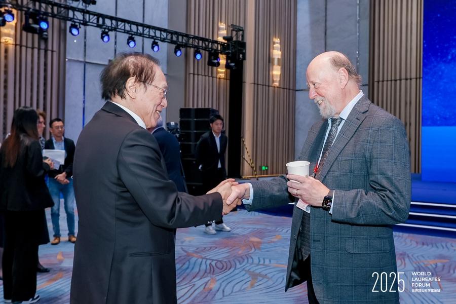 2013年諾貝爾化學獎得主邁克爾·萊維特在2025世界頂尖科學家論壇上同與會者交談。(文匯報記者 邢千里攝)
