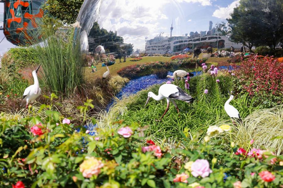 作品選用了大量應用在杭州高架上的網紅“西子系列”月季,團隊通過花期調控技術,確保月季在花展期間集中盛放,呈現最佳觀賞效果。同時搭配狼尾草、粉黛亂子草等觀賞草,其隨風搖曳的姿態能更好地呼應黃浦江江景,增添自然野趣。