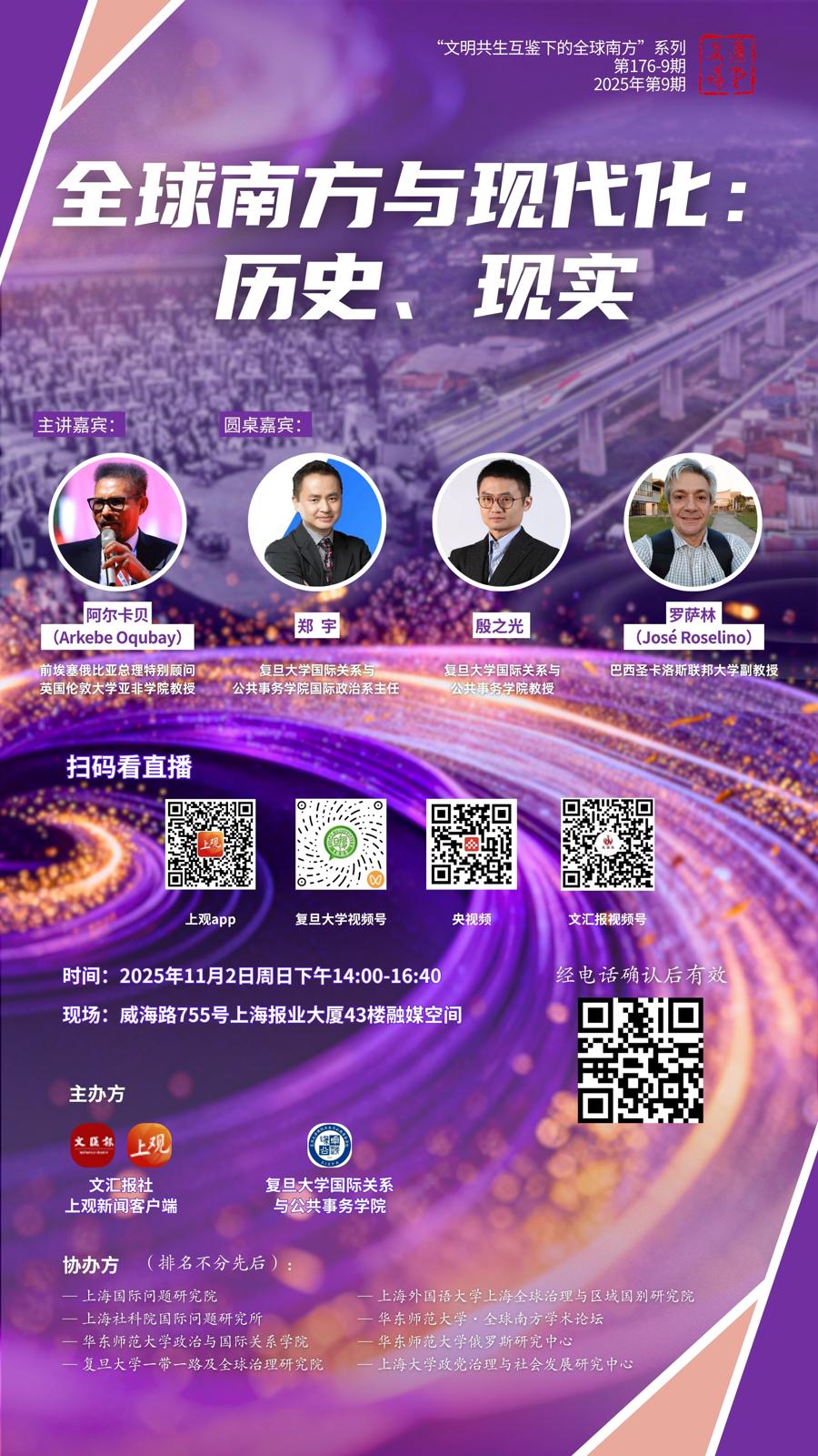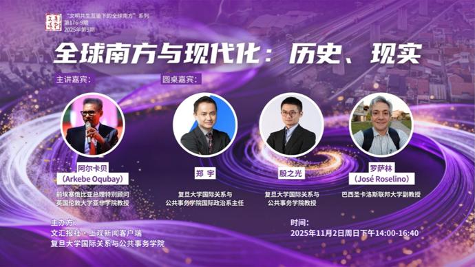 圓桌環節,正與復旦發展研究院合作開展“中巴數字經濟比較研究”項目的巴西聖卡洛斯聯邦大學何塞·愛德華多·羅薩林(José Eduardo Roselino)副教授,將介紹拉美上個世紀80年代爲何在那場危機中失去了發展動力,如今又如何借鑑全球南方各國的經驗教訓展開“再工業化和經濟現代化”戰略,以及巴西如何在金磚國家機制內與其他成員國融合發展,應對特朗普執政帶來的不確定、不穩定國際環境。復旦大學國際關係與公共事務學院教授殷之光將結合8月的埃塞俄比亞之行來闡釋中國經驗對後者社會能力建設的正面影響,並側重分享全球南方現代化的多樣性,其同事、“長江學者”特聘教授、國際政治系主任鄭宇主持圓桌。圓桌將圍繞三個主要話題展開:既往現代化道路探索的經驗與教訓?當下全球南方追尋現代化要解決的首要任務?全球南方如何既實現本國現代化又爲人類文明進步作出貢獻?