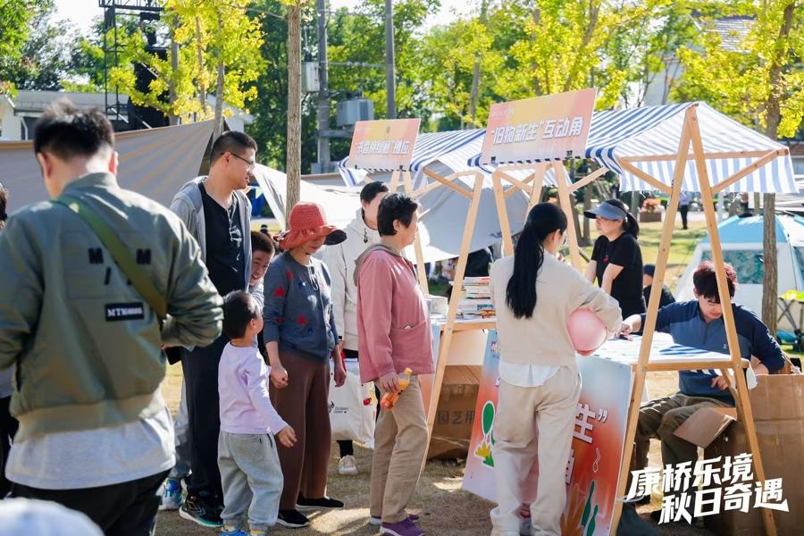 “綠色環保”是本次音樂節的另一重底色。在以舊“煥”新攤位前,居民們提着舊書有序排隊,符合標準的書籍可兌換健康輕食、有機蔬菜或小綠植。“家裏舊書堆着佔地方,換份綠植還能支持環保,一舉兩得!”居民王先生兌換完輕食,又帶着孩子在“舊物新生”互動角體驗DIY環保草編包製作。據瞭解,本次收集的500餘冊舊書將捐贈給延邊學校,而活動產生的所有垃圾則通過分類處理納入康橋鎮“濱河慢行系統”的生態循環體系。從御葉路濱河綠地的口袋公園到百曲港童悅空間的親水平臺,生態理念正通過這類互動實踐融入居民日常。