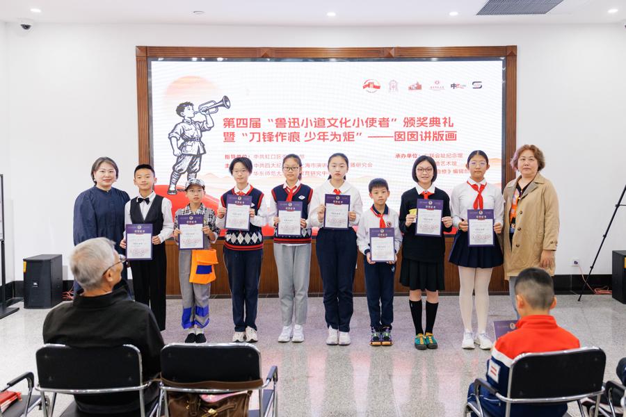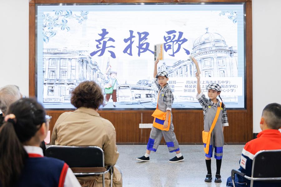 現場,來自滬上多所學校的中小學生獲“魯迅小道文化小使者”稱號。孩子們還用歌聲與肢體演繹《賣報歌》的故事。