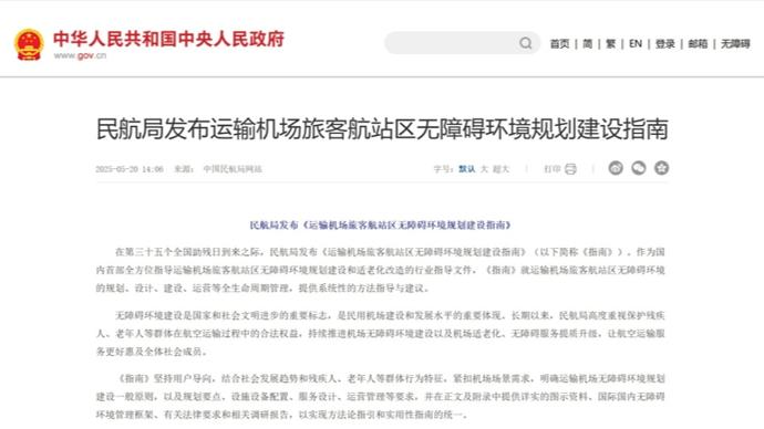 今年5月,民航局發佈的《運輸機場旅客航站區無障礙環境規劃建設指南》提出,堅持用戶導向。重點聚焦機場服務場景特徵,在重點保障殘疾人出行需求的同時,兼顧老年人、傷病旅客、與嬰幼兒同行旅客、攜帶大件行李旅客等羣體在抵離機場、候機、登機等環節中的實際困難,以通用設計提升服務包容性和友好性,推動運輸機場無障礙環境建設從“滿足基本需求”向“促進融合共享”邁進。同時,《指南》聚焦無障礙設施、無障礙信息、無障礙服務三方面內容,推動打造兼顧硬件設施和軟性服務的機場旅客航站區無障礙環境。