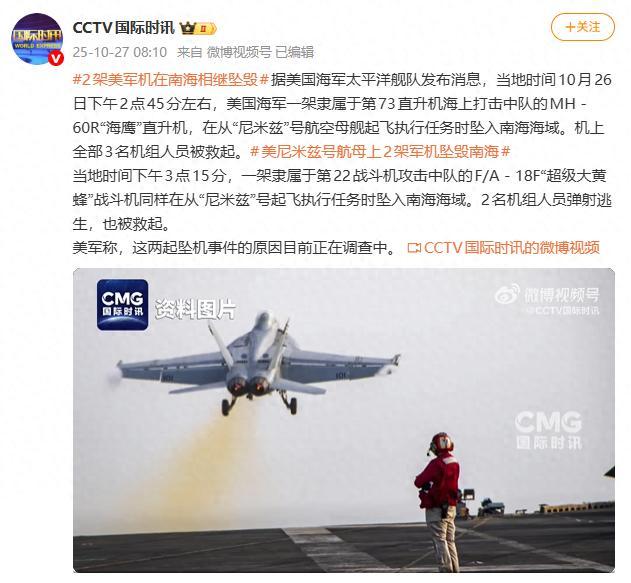 據美國海軍太平洋艦隊發佈消息,當地時間10月26日下午2點45分左右,美國海軍一架隸屬於第73直升機海上打擊中隊的MH - 60R“海鷹”直升機,在從“尼米茲”號航空母艦起飛執行任務時墜入南海海域。機上全部3名機組人員被救起。