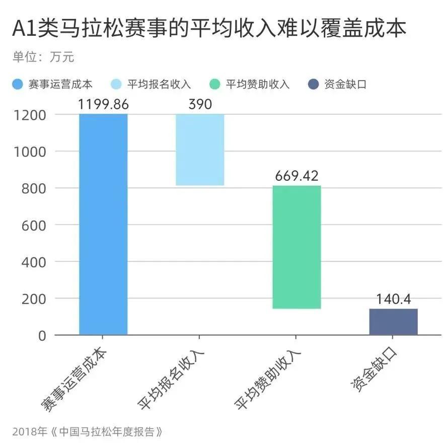 2018年《中國馬拉松年度報告》的數據顯示,一場3萬人的A1賽事,平均支出爲1199.86萬元,報名收入爲390萬元,贊助收入爲669.42萬元,算下來平均超過100萬元缺口,只能地方政府硬着頭皮上了。