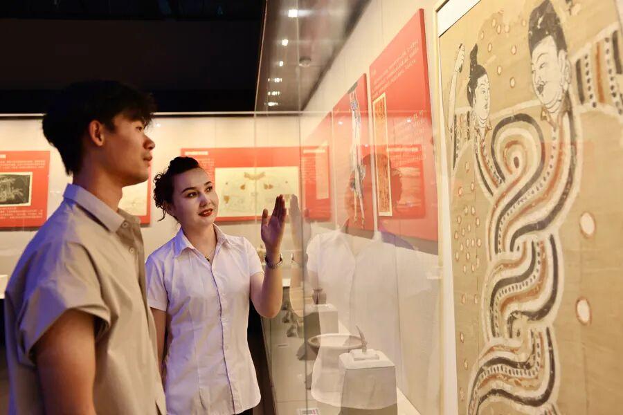 吐魯番博物館維吾爾族講解員熱孜萬古麗·依拉音向遊客講解伏羲女媧絹畫
