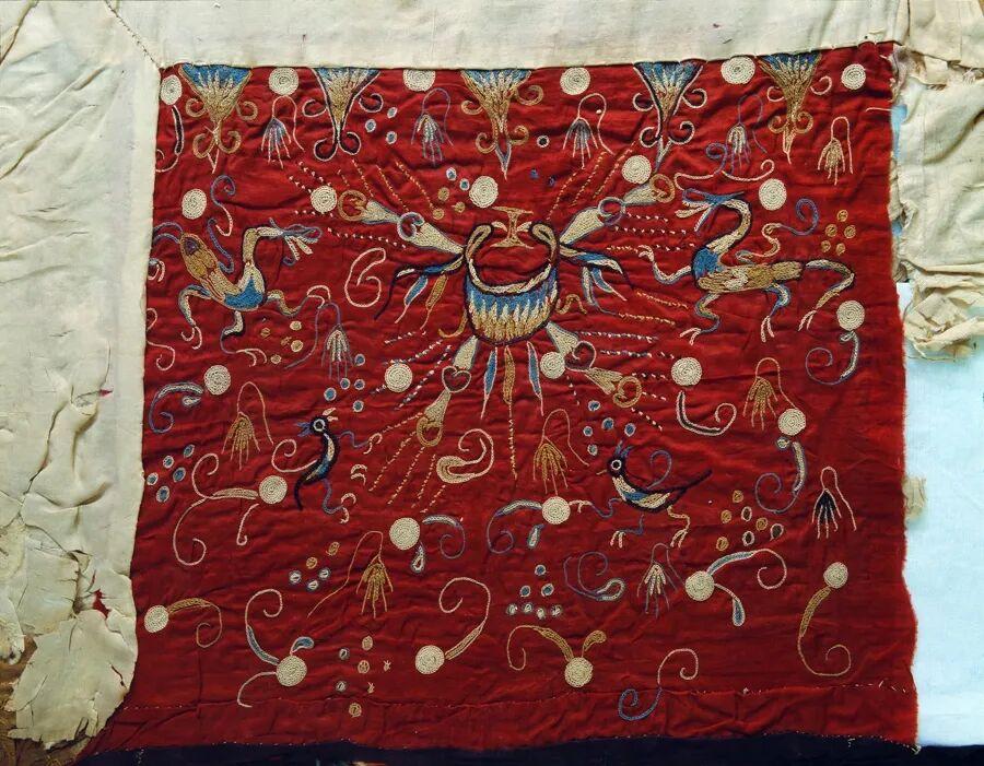 紅底鳥籠卷草紋刺繡,即“共命鳥”