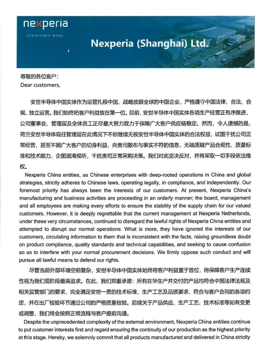 今年9月底荷蘭以“防止關鍵技術轉移”爲由,強行接管了安世總部,還強行終止了中國高官的職務,迫使其離開了荷蘭。