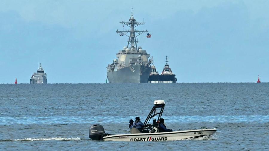 10月26日,美軍導彈驅逐艦“格雷夫利”號(上中)在特立尼達和多巴哥首都西班牙港附近海域航行。 新華社發