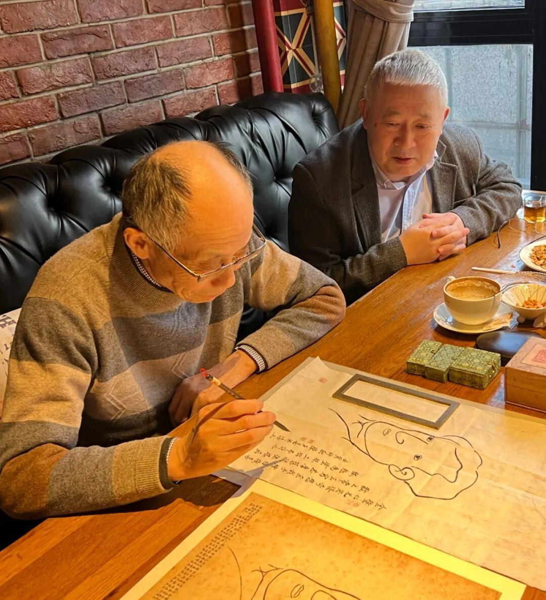 本文爲《張偉自選文存》序。上圖:張偉在“巴洛斯”咖啡館看陳子善寫字。
