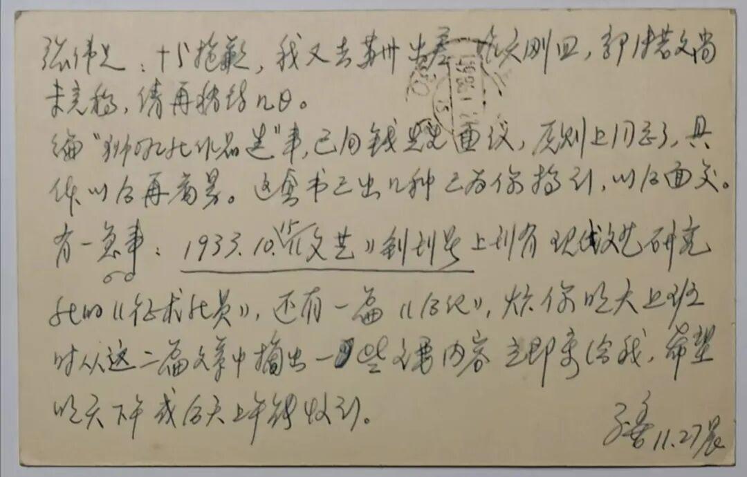 有一急事。1933.10.15《文藝》創刊號上刊有現代文藝研究社的《徵求社員》,還有一篇《後記》,煩你明天上班時從這兩篇文章中摘出一些主要內容,立即寄給我,希望明天下午或後天上午能收到。