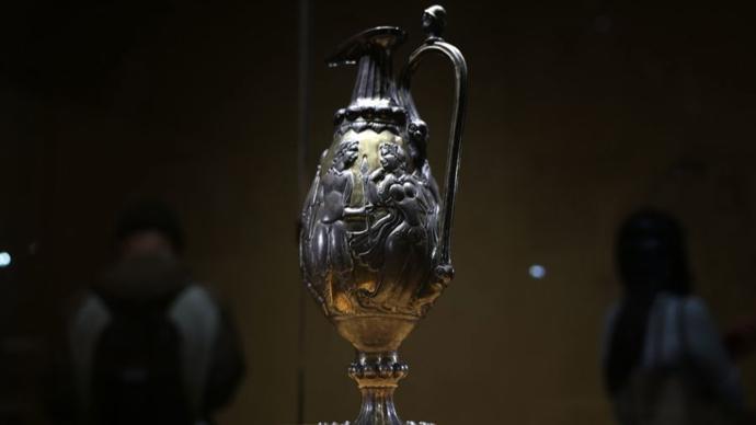 身姿挺拔,上腹細長、下腹圓鼓,通體閃耀華光,壺身層疊的浮雕與環形單把頂端的雕塑,現出深目高鼻的洋人形象……“看起來分明是外國器物!”面對鎏金銀壺,觀衆難免心生疑惑。“混血”感十足的這尊精美銀壺,爲何出現在中國西北腹地?