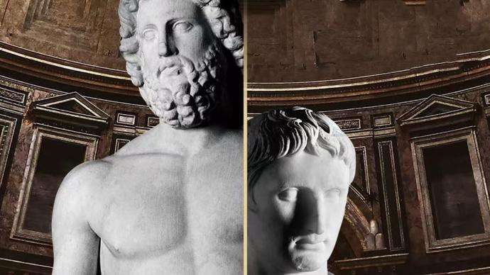 其中,“衆神的傳說”聚焦古希臘古羅馬神祗雕塑羣像。如2米左右的天神宙斯(朱庇特)雕像、波塞冬(尼普頓)半身頭像等近20件大型神像,揭示古羅馬人對古希臘神話的“創造性轉化”——並非簡單復刻浪漫敘事,而是將神明職能與城邦發展需求深度綁定,構建務實的“人神契約”,讓觀衆理解古羅馬信仰體系的獨特內核。