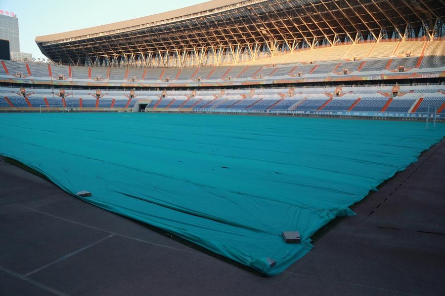 爲保證草皮溫暖過冬,濟南奧體中心在冬季爲球場鋪上無紡布保暖