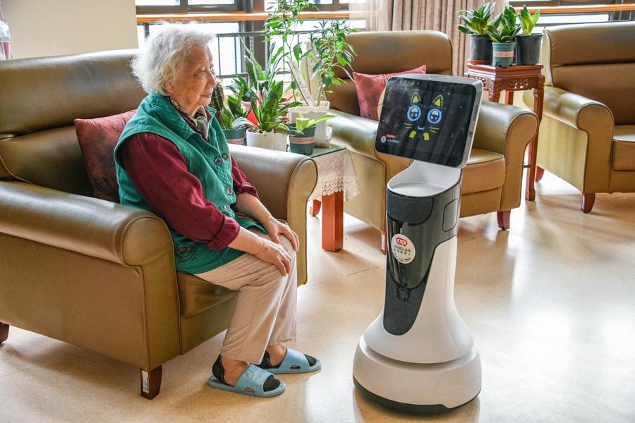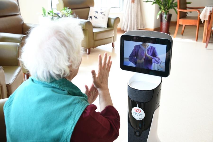 圖爲閔行區君蓮養老院內的機器人正與老人互動。/文匯報記者邢千里攝