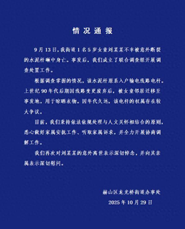 9月13日, 湖南益陽市赫山區龍光橋街道 1名5歲女童被意外斷裂的水泥杆砸中身亡。對此, 龍光橋街道辦事處10月29日晚發佈情況通報。
