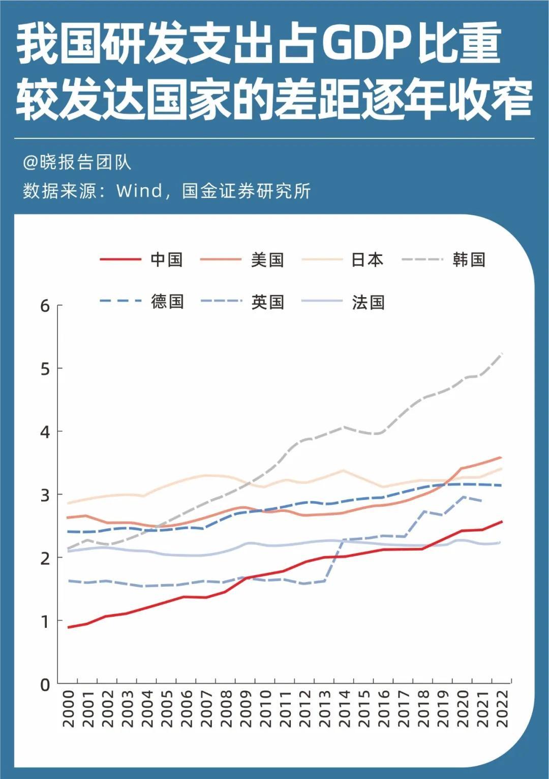 當前,我國科技成果轉化率最高約爲30%,遠低於發達國家60%—70%的水平;知識產權收入僅佔貿易總額的0.4%,與研發投入強度不匹配。更關鍵的是,作爲被原始創新和顛覆性創新高度依賴的基礎研究一環,2024年我國基礎研發支出佔比爲6.9%,美英日韓等則通常保持在12%—15%左右。