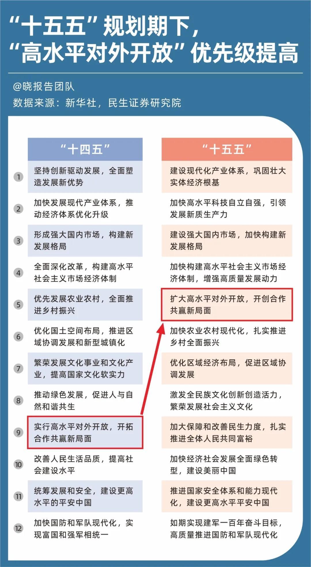 值得注意的是,在“十五五”規劃建議中,對比“十四五”時期,“高水平對外開放”的優先級顯著提升,定調也從基礎的“實行”轉向更進取的“擴大”。這意味着企業出海和中國“再全球化”將迎來紅利。