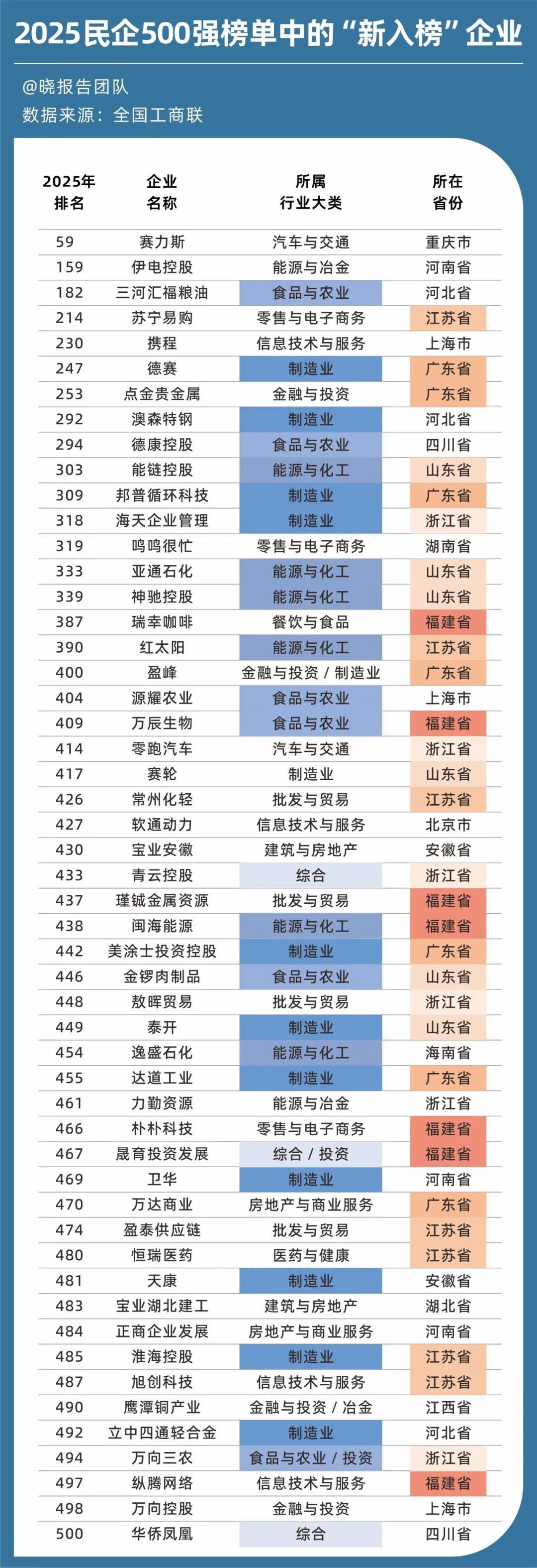 在這52家新上榜的民企中,近半數來自制造業、能源化工與食品領域。地域分佈上,福建、廣東、江蘇、山東和浙江則貢獻了主要力量,超65%的民企來自這些省份。