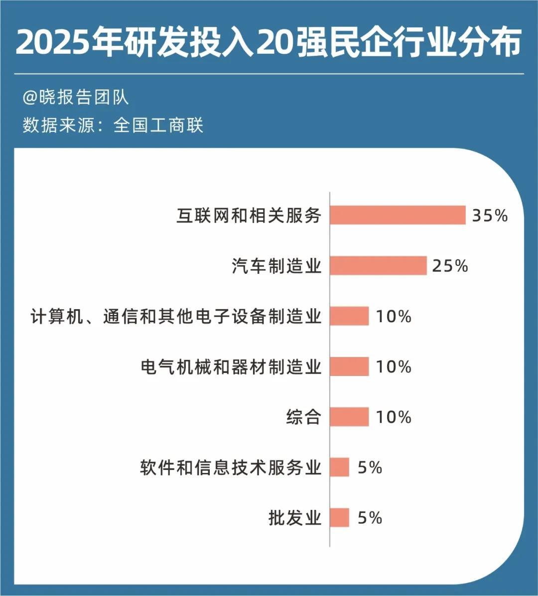 進一步來看,在工商聯發佈的2025年“民營企業研發投入500強榜單”中,來自計算機通信、互聯網和汽車製造領域的民企構成了創新主力軍,它們包攬了研發投入前20強中的14席。