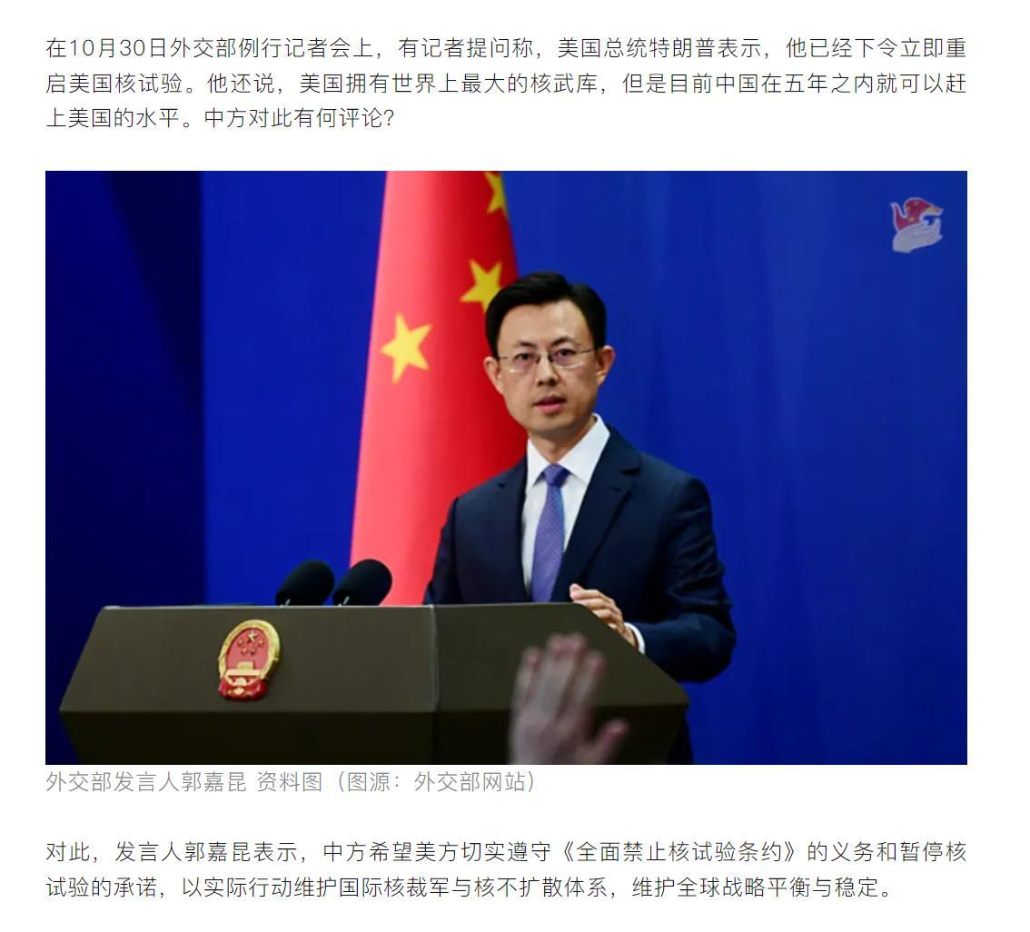 面對特朗普政府的突然宣佈,中國外交部迅速作出了回應,郭嘉昆表示,中方敦促美方切實遵守《全面禁止核試驗條約》的義務和暫停核試驗的承諾。