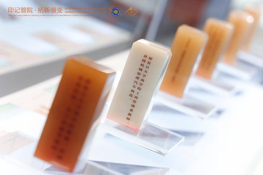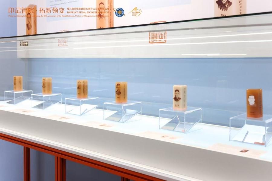 本次展覽以“梳理管院四十年曆程、詮釋百年商科人文”爲核心,分設一樓、二樓兩個展區,通過 “商科初創、發展變遷、拓新領變、求真卓越、緬懷與感恩、我是復旦人”六大板塊,系統呈現管院40年發展成就,共展出80餘件篆刻作品。