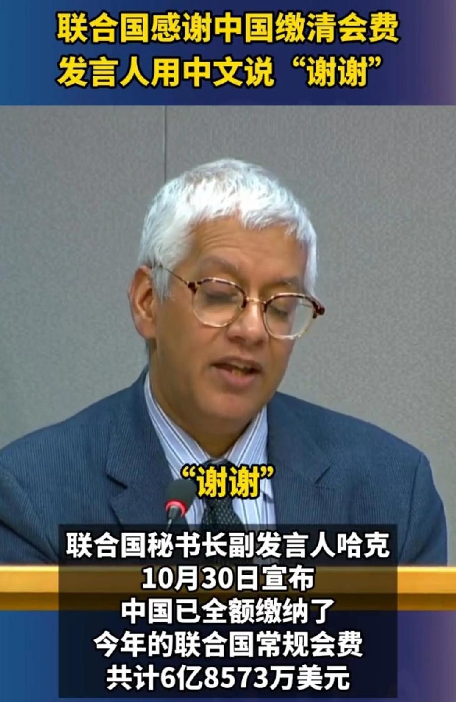 哈克用中文表達感激的原因是,中國已全額繳納了本年度的聯合國常規會費,總計6.8573億美元。