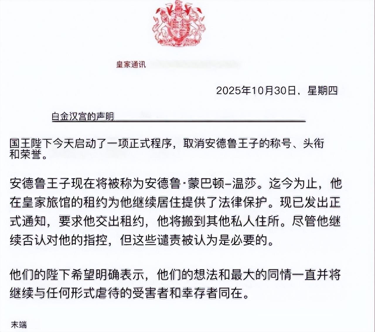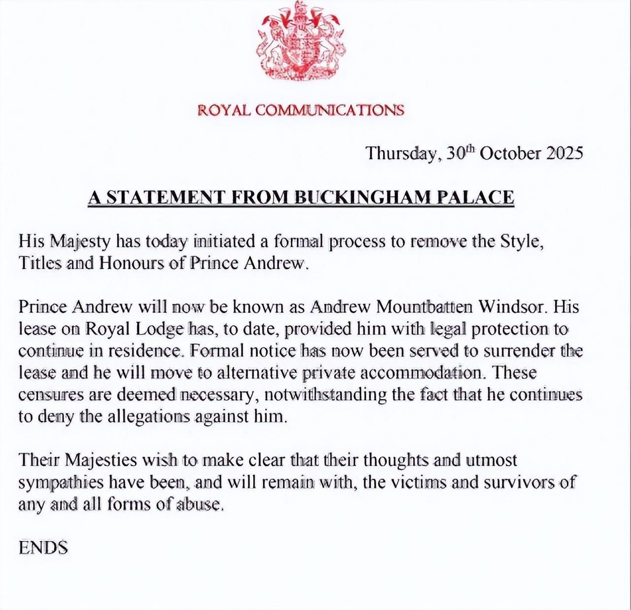 聲明中特別指出,安德魯今後不再享有“殿下”稱號,他從王室核心成員變爲普通公民,而且還必須搬離“皇家小屋”。