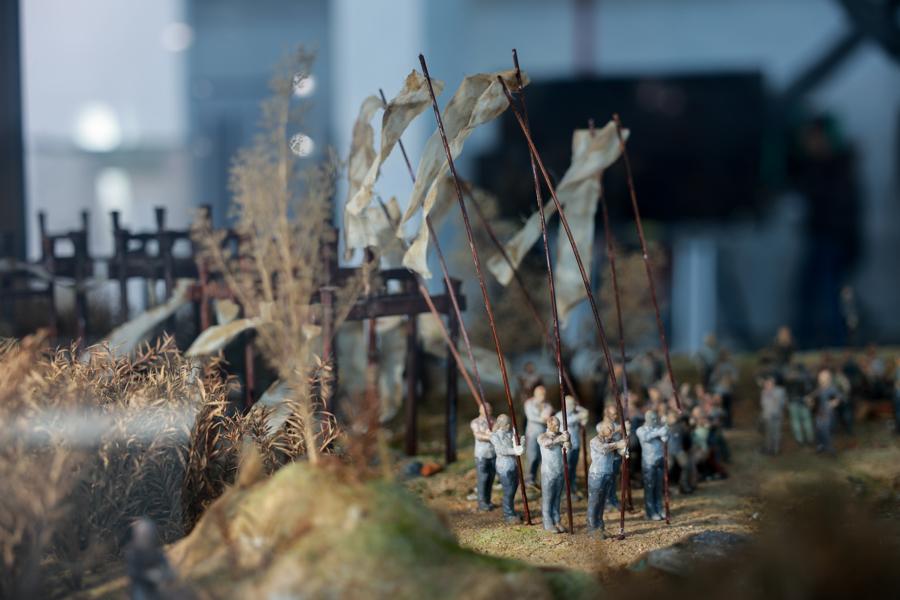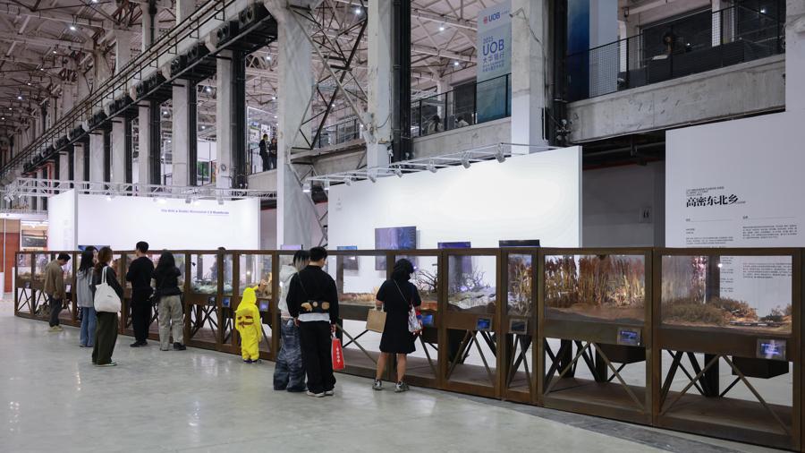 中國美術學院跨媒體藝術學院的牟森教授與媒介展演系33位師生歷時140天共同完成的微縮場景模型《高密東北鄉》長達21米,在現場頗爲引人注目。這件作品作爲江蘇大劇院原創話劇《紅高粱家族》項目的組成部分,以自然博物館標本展櫃作爲展示形態,由二十個標準“景箱”生動展現文學作品中的標本式圖景,爲華語文學經典的視覺轉譯探索全新的路徑。