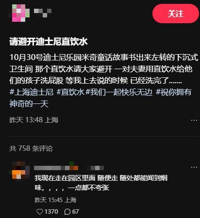 網友稱:10月30號迪士尼樂園米奇童話故事書出來左轉的下沉式衛生間,那個直飲水請大家避開,一對夫妻用直飲水給他們的孩子洗屁股,等我上去說的時候已經洗完了……這處直飲水設備明確用大字標明瞭是直飲水,旁邊就是衛生間,對於她的疑問,對方表示不知情。