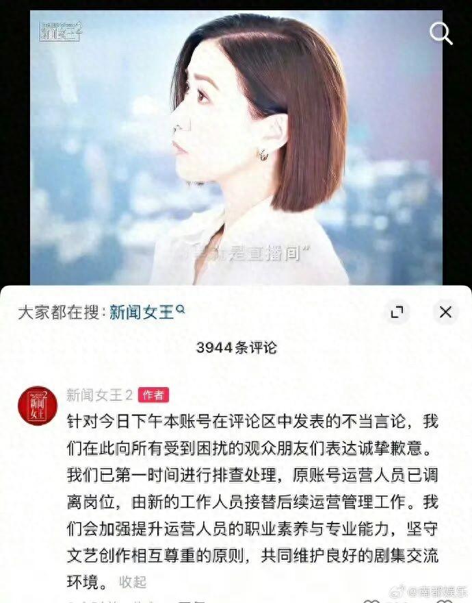 隨後,《新聞女王2》賬號發文道歉,稱:“針對今日下午本賬號在評論區中發表的不當言論,我們在此向所有受到困擾的觀衆朋友們表達誠摯歉意。我們已第一時間進行排查處理,原賬號運營人員已調離崗位,由新的工作人員接替後續運營管理工作。我們會加強提升運營人員的職業素養與專業能力,堅守文藝創作相互尊重的原則,共同維護良好的劇集交流環境。”