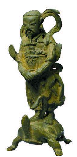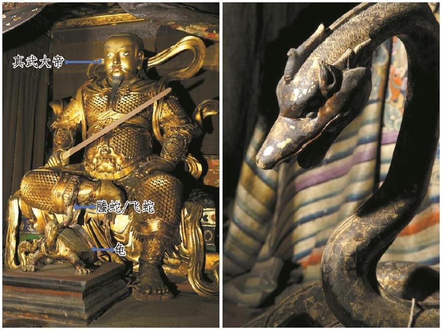 宋代學者俞琰的筆記《席上腐談》描述了世人認爲玄武爲龜與螣蛇相纏的緣故:“北方七宿如龜形,其下有螣蛇星,蛇,火屬也,丹家藉此以喻身中水火之交,遂繪爲龜蛇蟠糾之狀。”六朝以後,神龜與螣蛇/飛蛇相纏形成的玄武被道教納入自己的神明體系,逐步變成了人格化的真武神將,保佑征戰勝利的戰神,並在後世又有了“玄天上帝”“真武大帝”等尊號。真武大帝既然是神龜和螣蛇兩種動物的人格化呈現,自然其神像也經常與神龜、螣蛇/飛蛇共同出現。道教經典《元始天尊說北方真武妙經》也描繪道:“真武神將敬奉天尊教敕,乃披髮跣足,踏螣蛇八卦神龜。”
