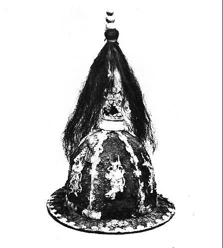 定陵出土的明神宗御用鐵甲後部鏨刻有真武大帝圖案,同出的鐵盔的盔頂也嵌有一尊真武大帝像,其下方則嵌了金六甲神,從特徵上極可能是《大明會典》中兵仗局所造“鍍金護法頂香草壓縫六瓣明鐵盔”。