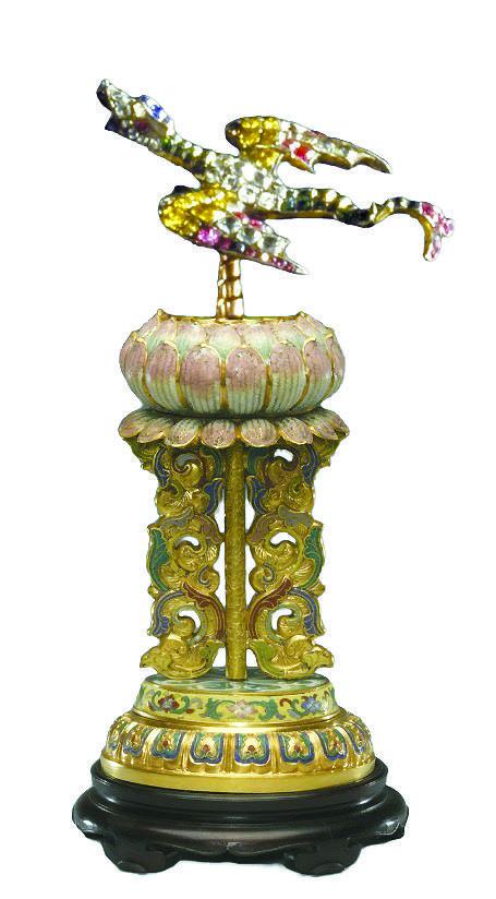 除了將這種鑲嵌金剛石的“西洋龍”製成首飾,檔案還在乾隆二十四年(1759)、三十八年(1773)和三十九年(1774)提到,這種西洋龍被改造成了佛前的供器(檔案中稱“供養”),並且配備了蓮花座。目前暫時還未找到這種西洋供器的實物,筆者試圖用清宮常見爲供奉神佛的“七珍八寶”配製的蓮花座與清宮西洋鐘錶上的嵌寶石西洋龍/飛蛇結合在一起製作了一張圖(見配圖:“金剛石飛蛇”供器可能的樣貌),可見這件供器呈現的多種文化元素雜糅的新奇樣貌。