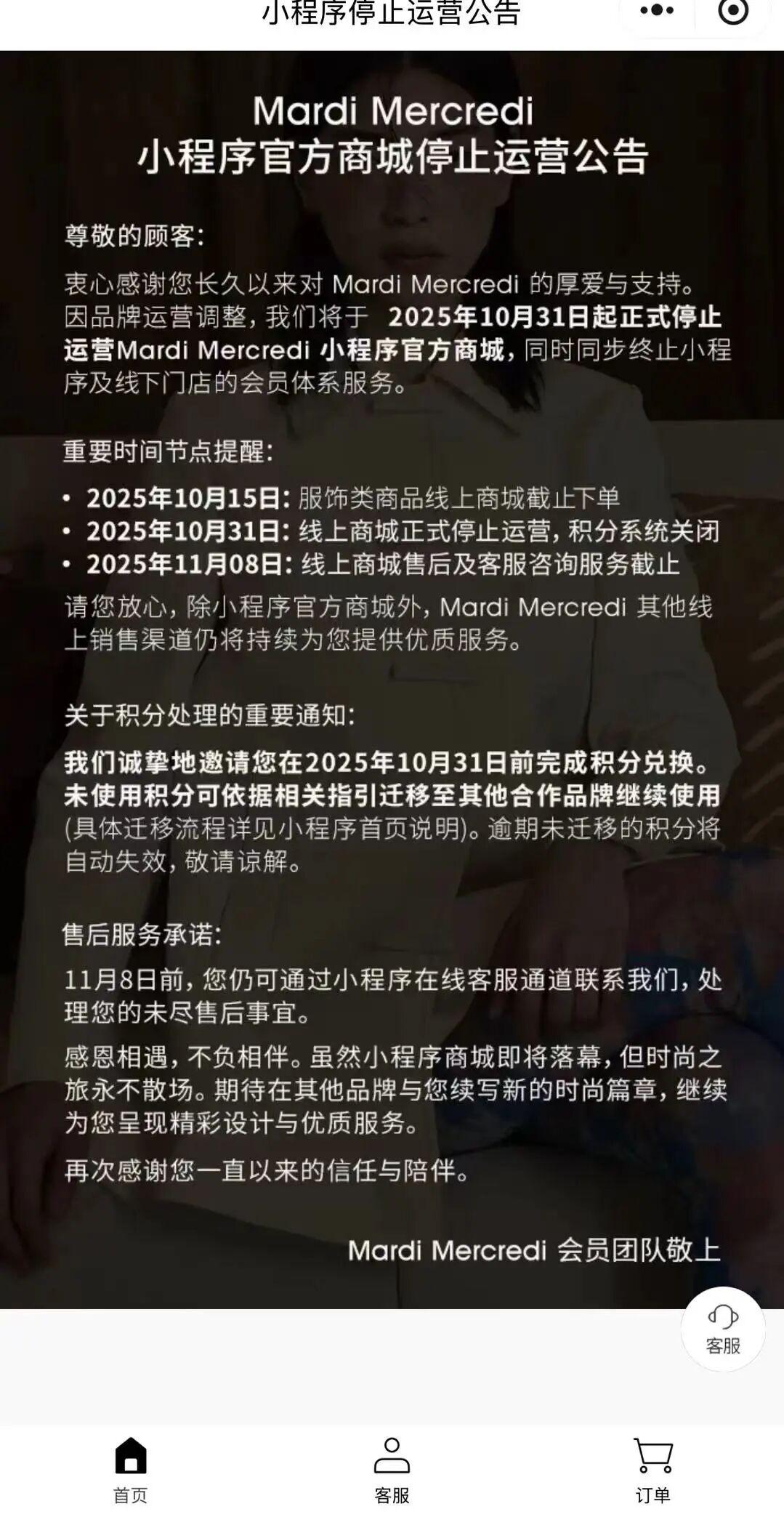 在線上渠道,Mardi Mercredi品牌微信小程序官方商城也發佈通知稱,商城將於10月31日起停止運營,同時同步中止小程序及線下門店的會員體系服務。會員需在10月31日前完成會員等級及積分向RAIVE、Rest&Recreation兩個品牌的遷移,逾期未操作則等級、積分自動失效。其中,服飾類商品線上商城已於10月15日截止下單;10月31日起線上商城正式停止運營,積分系統關閉;11月8日,線上商城售後及客服諮詢服務將截止。