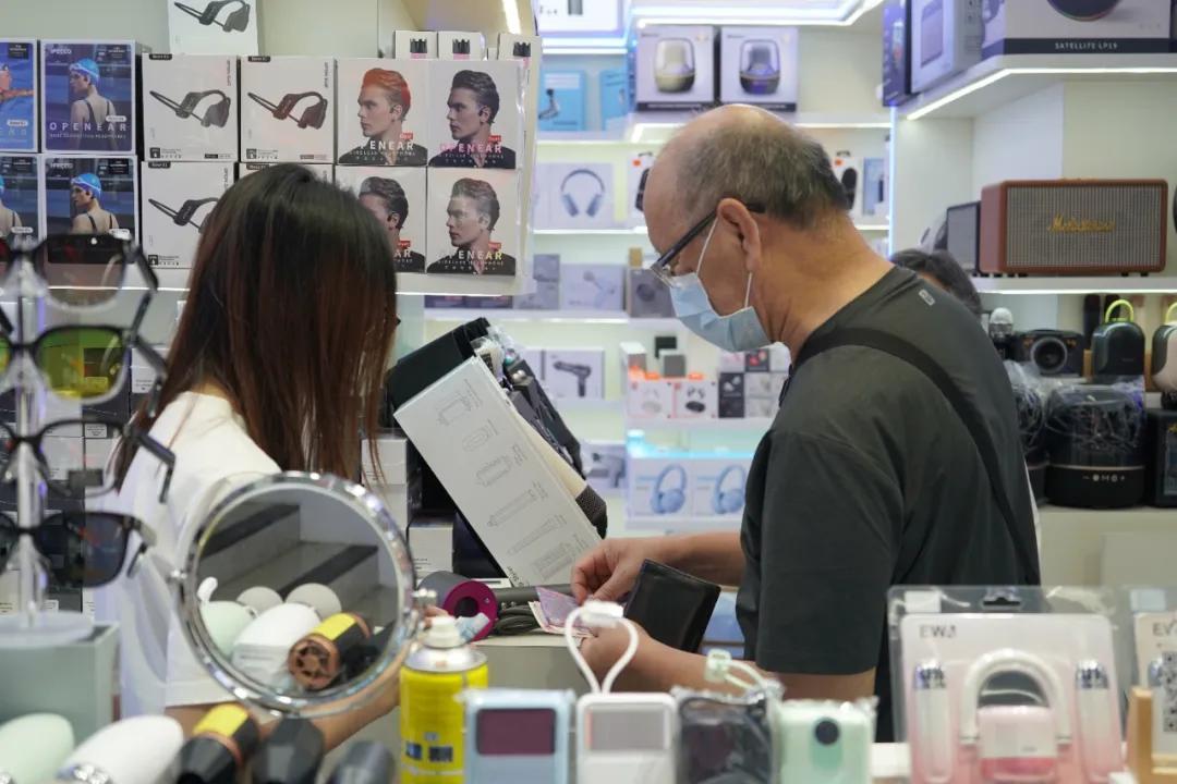 90後小雨在華強北做檔口已經近10年,以前專賣自家工廠生產的藍牙耳機。今年5月,她把門面重新裝修,掛上了“AI穿戴”的招牌,開始主賣AI翻譯耳機。