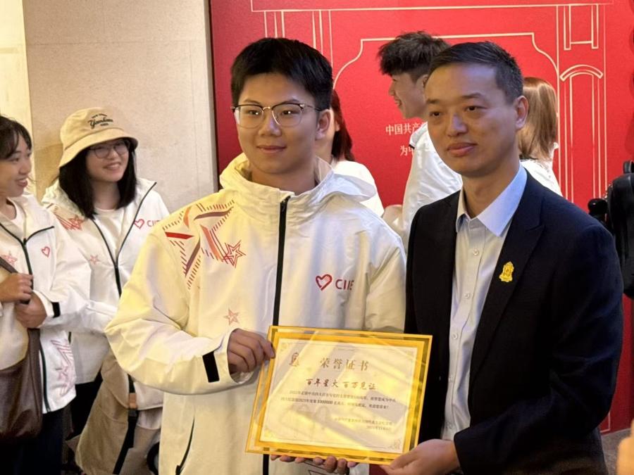 中共四大紀念館黨支部書記、館長徐雪琛祝賀澳門“小葉子”郭祺宇成爲今年紀念館的第100萬名觀衆。單穎文 攝