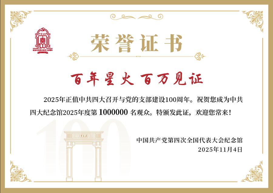 “3、2、1——恭喜!”上午9點51分,當安檢門提示音響起,來自澳門的郭祺宇走進中共四大紀念館,成爲今年到訪的第100萬名觀衆,這也是紀念館當年參觀量首次突破百萬。今年正值中共四大召開與黨的支部建設100週年,中共四大紀念館黨支部書記、館長徐雪琛爲郭祺宇送上榮譽證書和限定版文創產品。
